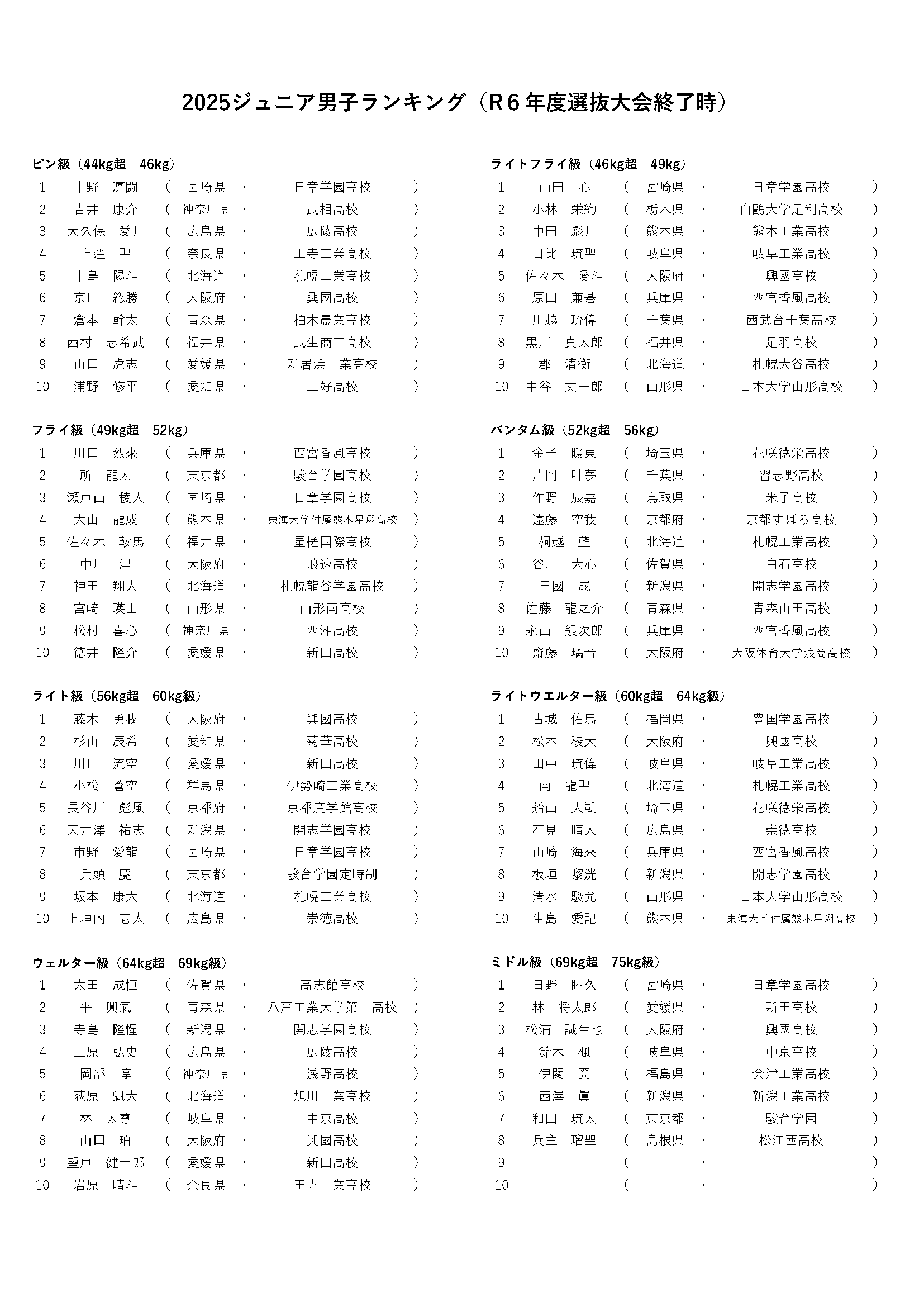 標記のことについて、令和6年度 第35回全国高等学校ボクシング選抜大会 兼 JOCジュニアオリンピックカップボクシング大会終了時点のランキングを下記の通り、発表させていただきます。