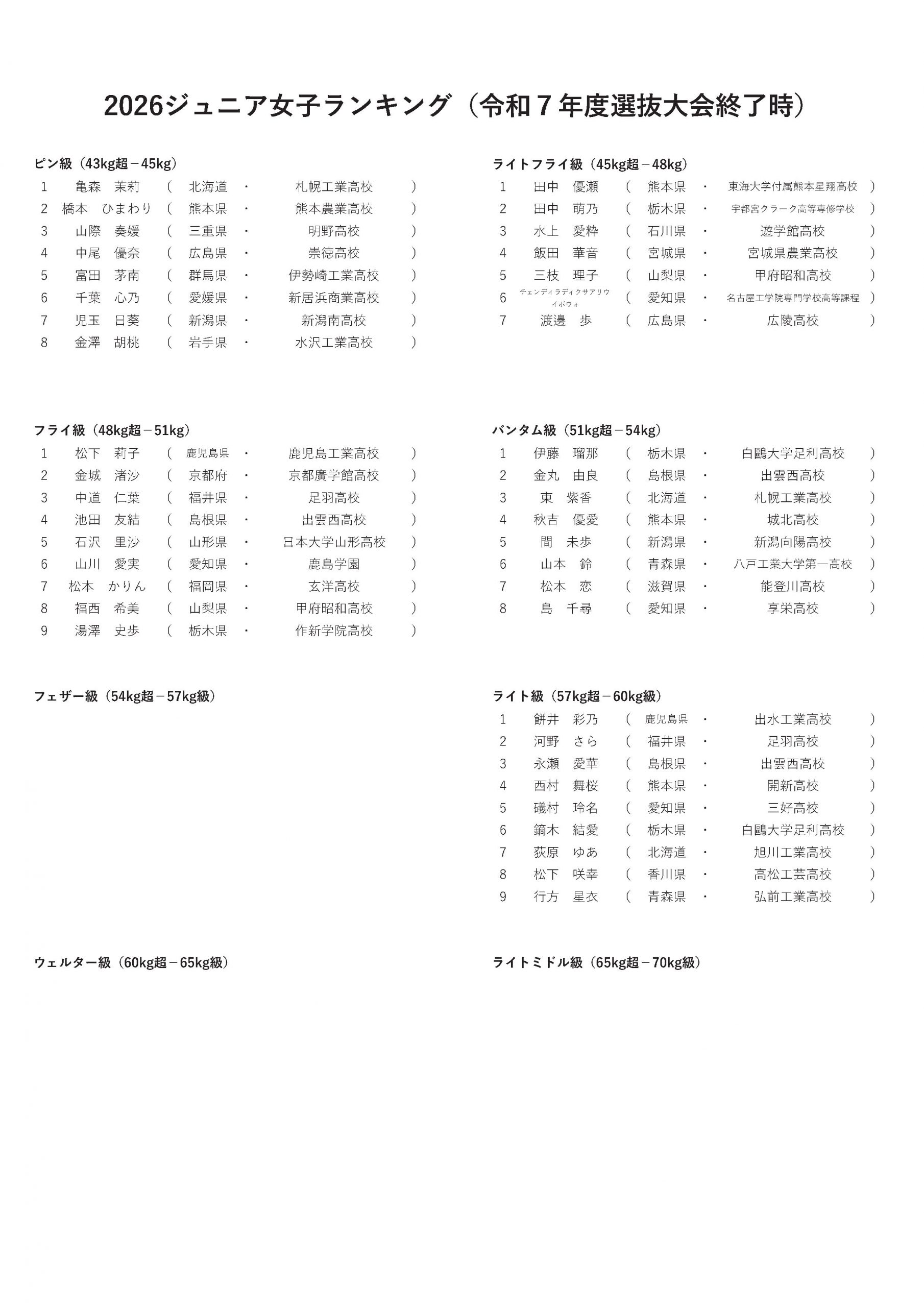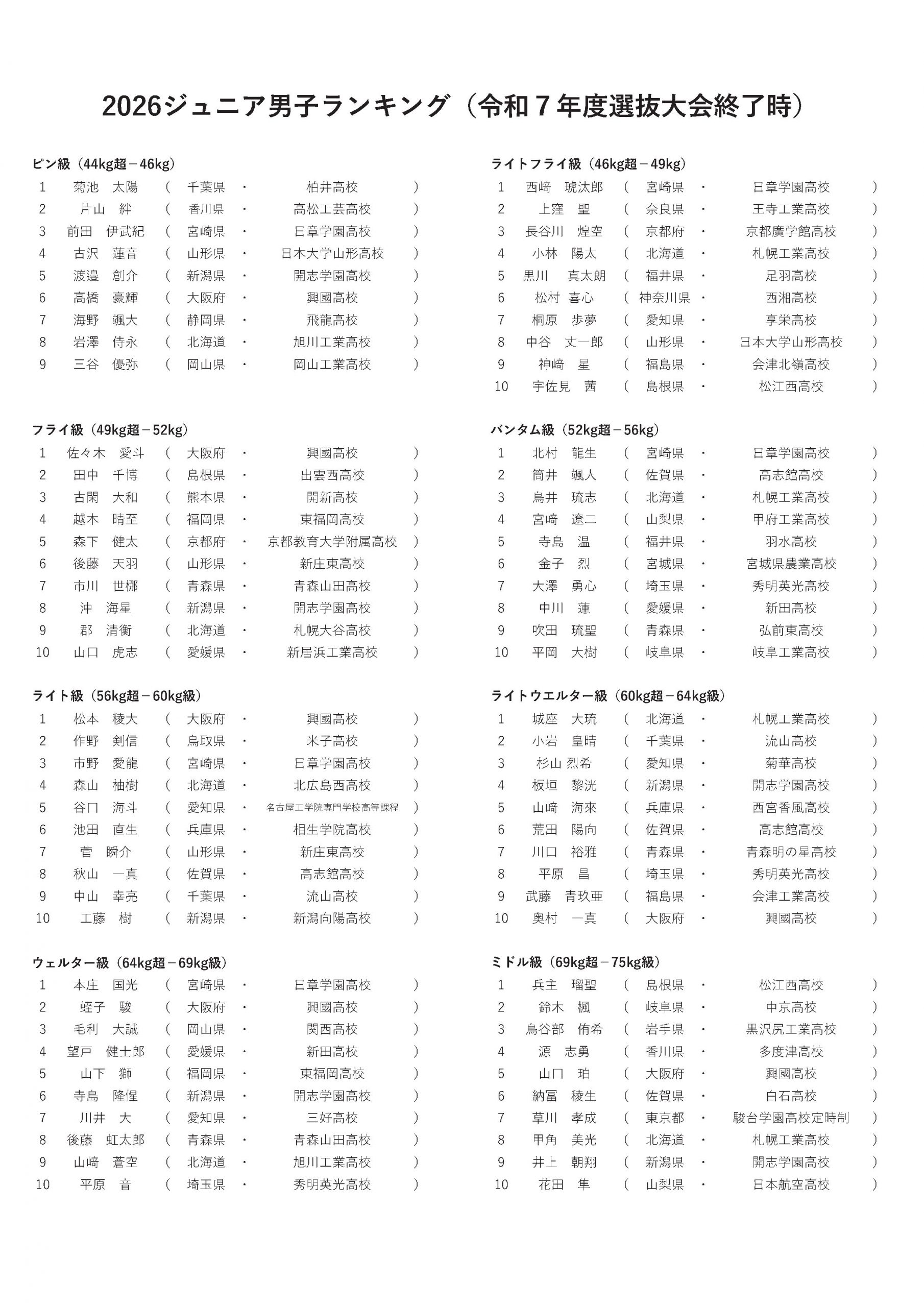標記のことについて、令和7年度 第36回全国高等学校ボクシング選抜大会 兼 JOCジュニアオリンピックカップボクシング大会終了時点のランキングを下記の通り、発表させていただきます。